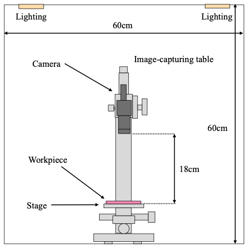 The appearance of the imaging equipment is shown in the image below. To prevent disturbance from external lighting, images were taken in an enclosed space of 60.0 cm×60.0 cm×60.0 cm with lighting placed above. And, image pairs of before/after defect occurrence were obtained using the following imaging method: